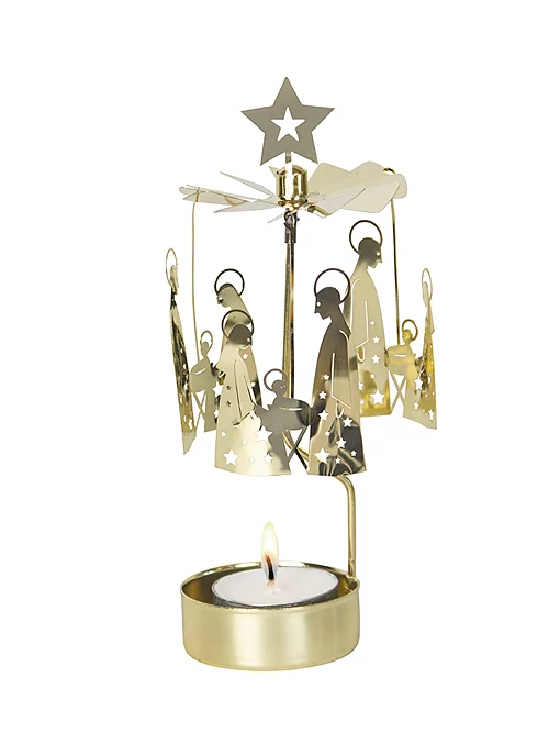 Änglaspel krubba skapar en trivsam julstämning i ditt hem. Snurrande änglaspel i skimrande guldmetall med plats för värmeljus nertill.