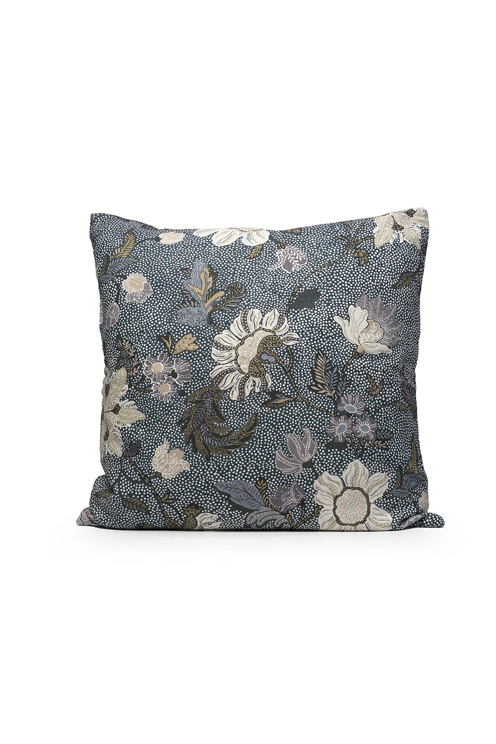 Kuddfodral i vackert blommönster Flower linen med blå bakgrund.