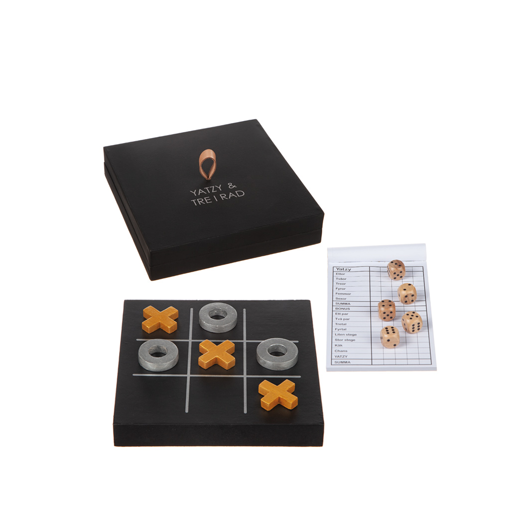 Snygg trälåda med skinnknopp innehållande Yatzy och Tre i rad. Fin att ge bort i present.