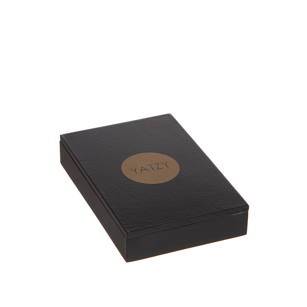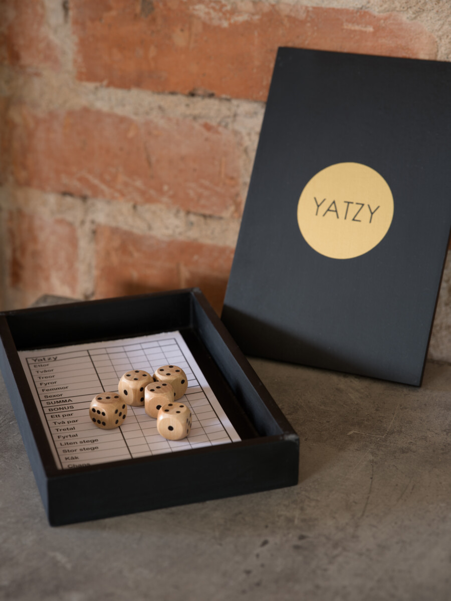 Yatzy i låda svart med guldtext är fin att ge bort i present. Snygg design i svart trälåda med enkel text Yatzy på locket. Låda innehåller block och tärningar.